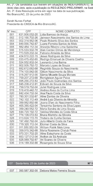 O Conselho Municipal dos Direitos da Criança e do Adolescente – CMDCA divulgou nesta sexta 23, o resultado preliminar dos aprovados no processo seletivo, para disputa das vagas de conselheiro tutelar da cidade de Rio Branco.